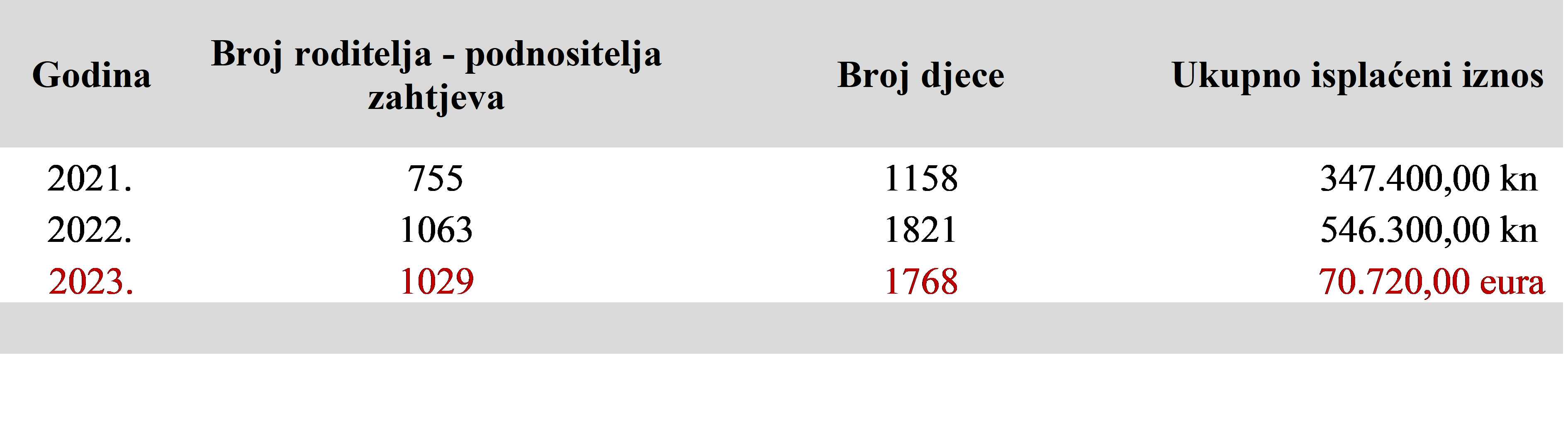 Prošle godine je iz gradskoga proračuna, za 1821 dijete, na račune 1063 roditelja, isplaćeno 546.300,00 kuna, dok je 2021. godine za 1158 djece, na račune 755 roditelja, isplaćeno ukupno 347.400,00 kuna.