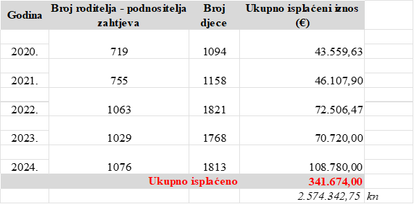 Jednokratna novčana pomoć sufinanciranja školskog pribora, opreme i radnog materijala u iznosu od 60,00 eura po djetetu/učeniku isplatila se 3. listopada 2024. godine na račune roditelja/skrbnika, a temeljem predanih zahtjeva.